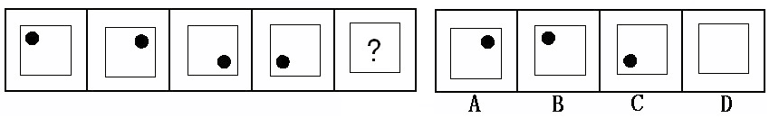 (答案:B。黑點(diǎn)在正方形中順時(shí)針移動(dòng)。在第5個(gè)圖形中,應(yīng)該正好移動(dòng)到左上角。)