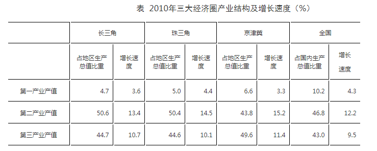 三大經(jīng)濟(jì)圈中,2010年三次產(chǎn)業(yè)增長(zhǎng)速度均超過(guò)全國(guó)平均水平的有幾個(gè)?